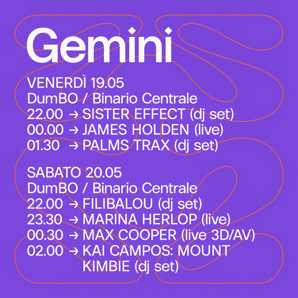 Una gemmazione primaverile inaspettata, ma bellissima: il 19 e 20 maggio, negli spazi collaudati e sempre affascinanti di DumBO, ROBOT presenta GEMINI: un omaggio al segno zodiacale, all’idea di sdoppiamento organico, alla capacità di “guardare le stelle”. La line up infatti è particolarmente preziosa ed immaginifica, con artistə attentamente selezionatə tra chi riesce a plasmare la musica elettronica da club verso i confini più astrali, elaborati e sofisticati.