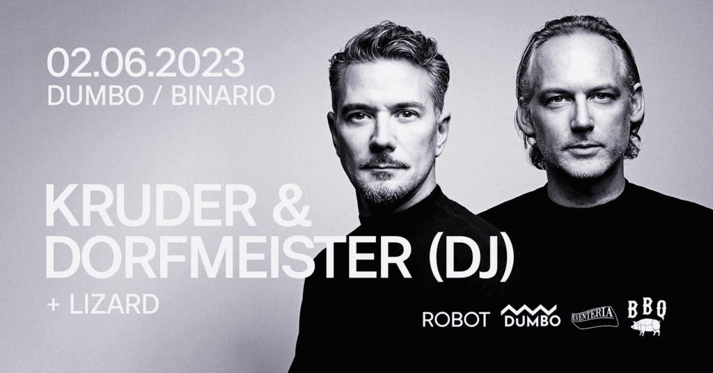 La notte del 2 giugno ROBOT e DumBo saranno di nuovo in pista con un duo esplosivo: Kruder & Dorfmeister, DJ dalla carriera ormai più che trentennale, ritornano a Bologna per celebrare la chiusura ufficiale della stagione invernale. Bandiera vivente del downtempo alla maniera viennese, i due hanno collaborato negli anni con artisti del calibro di Madonna, Depeche Mode e Reni Size.